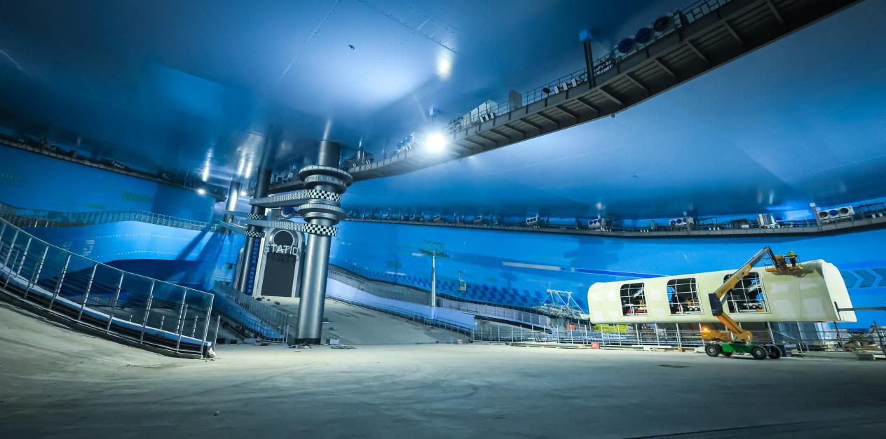 盡管室內(nèi)滑雪場(chǎng)仍在施工中,但嶄新的雪具大廳已經(jīng)進(jìn)入裝修的最后階段,分布在墻上和頂棚的藍(lán)色光帶營造的雪花造型,給人以強(qiáng)烈的視覺沖擊。進(jìn)入到滑雪場(chǎng)內(nèi)部,四條不同等級(jí)的雪道顯露真容,拖掛式纜車的核心設(shè)備已安裝到位,空中纜線基本鋪設(shè)完成。
