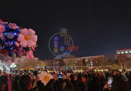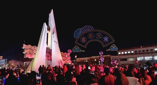 隨后,萬(wàn)眾期待的無(wú)人機(jī)表演正式亮相,千余架無(wú)人機(jī)在夜空中緩緩升空,隨著音樂(lè)節(jié)奏不斷變換造型,“元宵”“飛馳的駿馬”“翱翔天空的巨龍”等圖案,“喜樂(lè)元宵”“遇見(jiàn)美好奔赴安圖”等字樣在夜空中次第呈現(xiàn),勾勒出唯美浪漫的立體畫(huà)面,引得現(xiàn)場(chǎng)觀眾紛紛舉起手機(jī),記錄下這一震撼而美好的瞬間。