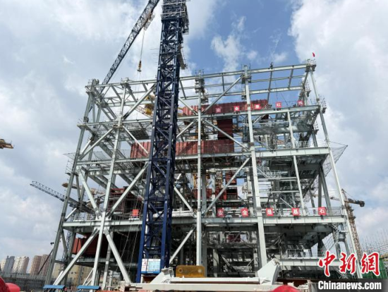 記者在施工現(xiàn)場看到,千余名工人與塔吊等機械協(xié)同作業(yè),安裝鍋爐鋼架、煙筒筒壁、冷卻塔、脫硫設(shè)施等關(guān)鍵設(shè)施。