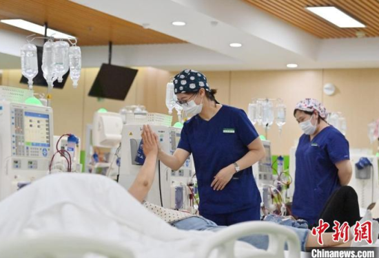 5月9日,長春中醫(yī)藥大學附屬醫(yī)院腎病科門診透析室內(nèi),護士在為患者加油打氣。 張瑤 攝