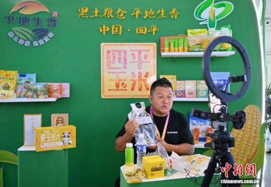 8月15日,吉林長春,商家在農(nóng)博園內(nèi)直播售買玉米。當天,第二十四屆中國長春國際農(nóng)業(yè)·食品博覽(交易)會在長春開幕。本屆農(nóng)博會集中展示中國最前沿的農(nóng)業(yè)科技成果,彰顯“大國糧倉”的科技實力,吸引眾多參觀者近距離體驗現(xiàn)代種植技術及優(yōu)質農(nóng)產(chǎn)品。中新社記者 張瑤 攝