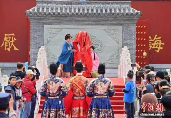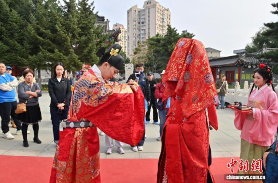 10月7日,吉林長春文廟舉行了一場明制漢婚沉浸式展演。漢服愛好者依次呈現(xiàn)奠雁、同牢、合巹等傳統(tǒng)禮儀,生動還原明代婚俗,F(xiàn)場通過流程講解與道具展示,解讀禮儀背后古人對婚姻與美好生活的寄愿。中新社記者 張瑤 攝