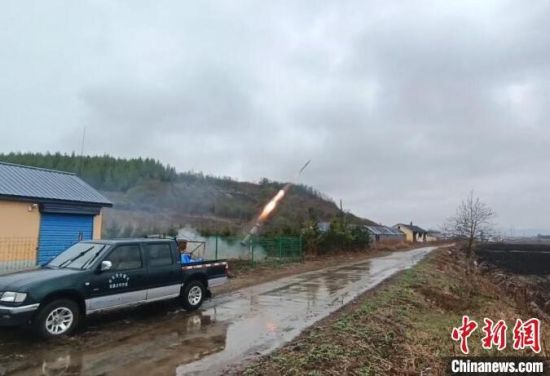 工作人員發(fā)射地面增雨火箭!〖质∪斯び绊懱鞖廪k公室供圖