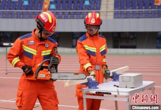 消防指戰(zhàn)員在進(jìn)行機(jī)動(dòng)鏈鋸的操作!埇 攝
