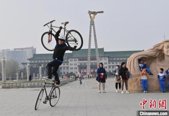 4月24日,在長(zhǎng)春市文化廣場(chǎng)內(nèi),64歲的市民周長(zhǎng)春表演自行車花樣絕技。站立騎行、脫把騎行等一系列驚險(xiǎn)刺激的動(dòng)作被周長(zhǎng)春完成得十分精彩,吸引市民圍觀。