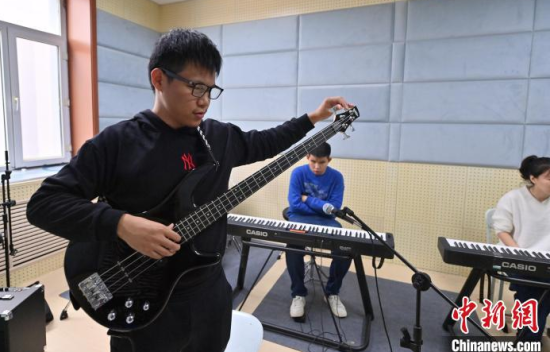 11月14日,吉林長春,“逐暗逐光”樂隊成員在交流排練細節(jié)。長春大學特教學院有一支名叫“逐暗逐光”的樂隊,樂隊成員都是視障學生。他們因音樂相聚在一起,用音樂去驅逐黑暗追逐光明。中新社記者 張瑤 攝