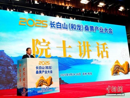 2025長(zhǎng)白山(和龍)桑黃產(chǎn)業(yè)大會(huì)25日在吉林省和龍市開(kāi)幕,圖為中國(guó)工程院院士李玉正在致辭。
